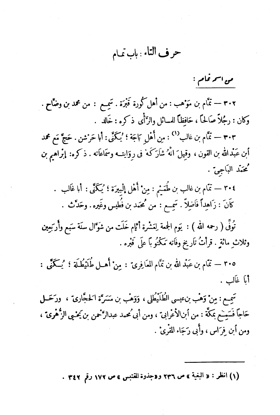 302 - تمَّام بن مَوْهب: من أهل كُورة قَبْرَة. سَمِع: من محمد بن وضَّاح. وكان: رجُلاً صَالحاً، حافِظاً للمسائل والرَّأي ذكره: خالد.