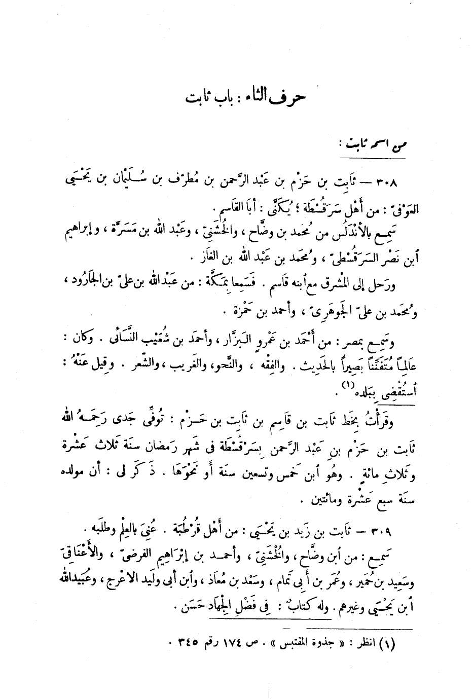 308 - ثَابِت بن حَزْم بن عبد الرَّحمن بن مُطرّف بن سليمان بن يحيَى العَوْفيّ: من أهْل سَرقُسْطَة؛ يُكَنَّى: أبا القَاسم.