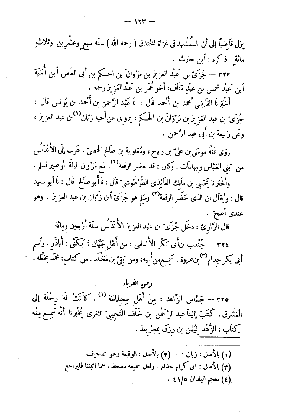 325 - جَسَّاس الزَّاهد: مِنْ أهْل سِجلِماسَة. كَانَتَ لَهُ رِحلَة إلى المَشْرق. كَتَبَ إليْنا عبد الرَّحمن بن خَلَف التّجيبِيّ الثغري يُخبرنا أنَّه سَمِع مِنه كِتاب: الزُّهْد لِيُمن بن رِزْق بمجْرِيط.