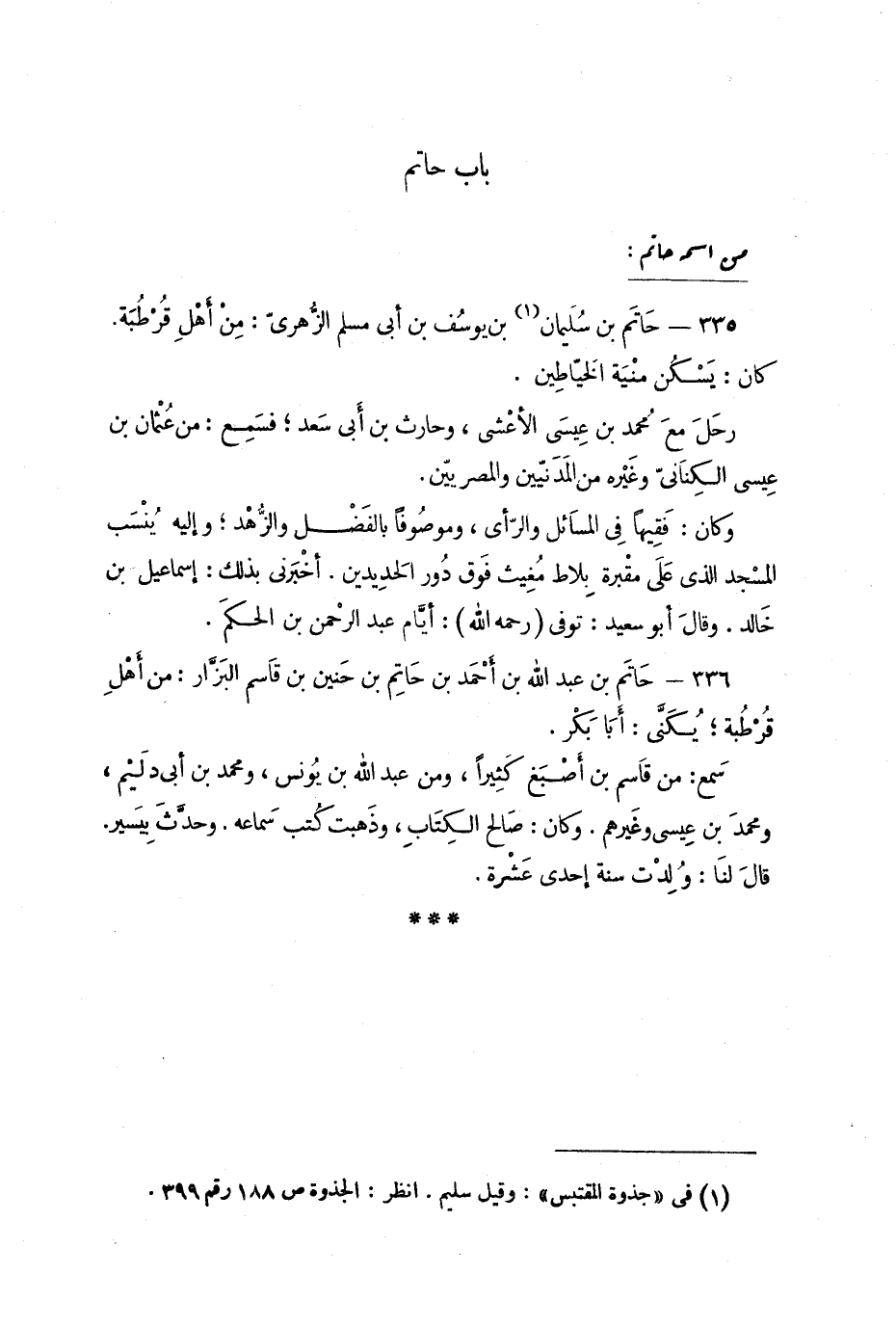 336 - حَاتَم بن عبد الله بن أحمد بن حَاتِم بن حَنين بن قَاسِم البَزَّار: من أهلِ قُرْطُبة؛ يُكَنَّى: أبَا بَكْر.