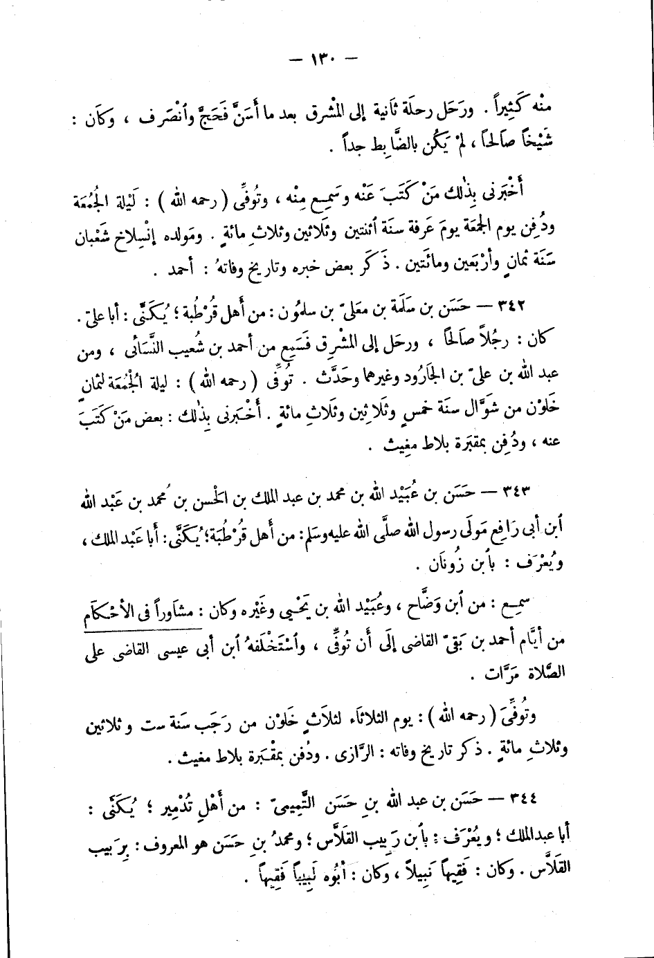 342 - حَسَنَ بن سَلَمة بن معَلىّ بن سلمُون: من أهل قُرْطُبة؛ يُكَنَّى: أبا عليّ. كان: رجُلاً صالِحاً، ورحلَ إلى المشْرِق فَسَمِع من أحمد بن شُعيب النَّسَائي، ومن عبد الله بن عليّ بن الجارود وغيرهما وحَدَّث. تُوفِّي (رحمه الله) : ليلة الجُمُعَة لثمانٍ خَلوْن من شَوَّال سَنة خمسٍ وثلاثين وثلاثِ مائةٍ. أخبرني بِذلك: بعض مَنْ كَتَبَ عنه، ودُفِن بمقبرة بلاط مِغيث.