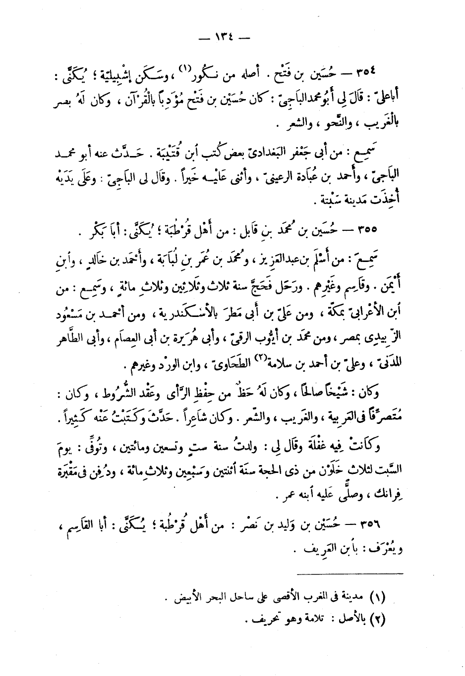 354 - حُسَين بن فَتح. أصله من نكُور، وسَكَن إشْبيليّة؛ يُكَنَّى: أبا عليّ: قالَ لِي أبو محمد البَاجِيّ: كان حُسَين بن فَتْح مؤَدِباً بالقُرآن، وكان لَهُ بصر بالغَريب، والنَّحو، والشّعر.