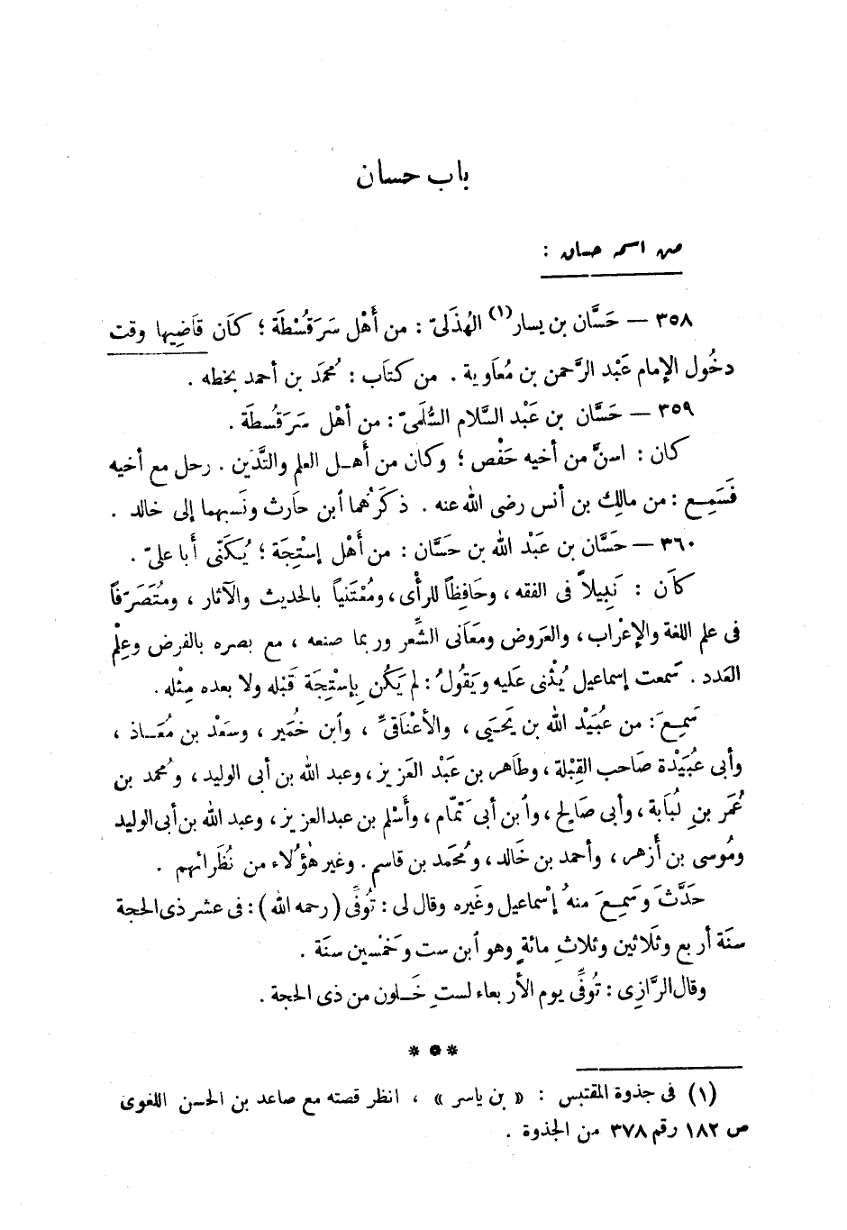 358 - حَسَّان بن يسار الهُذَليّ: من أهْل سَرَقُسْطَة؛ كانَ قاضِيها وقت دخُول الإمام عبد الرَّحمن بن مُعَاوية. من كتَاب: مُحمَّد بن أحمد بخطه.
