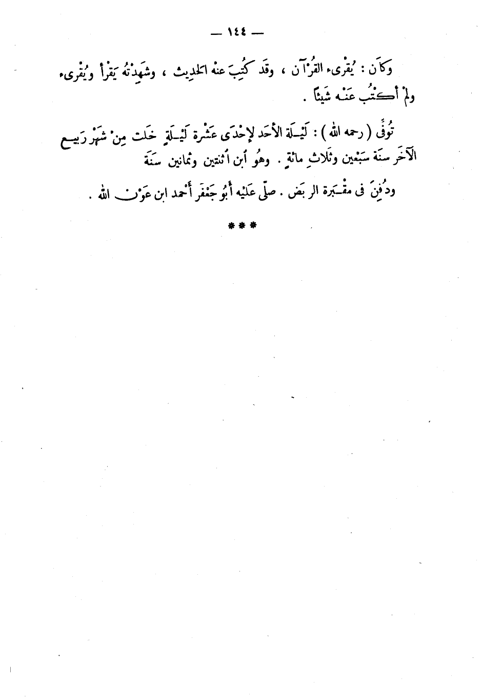 ودُفِنَ في مقْبَرة الربَض. صلّى عَليْه أبُو جَعْفَر أحمد ابن عَوْن الله.