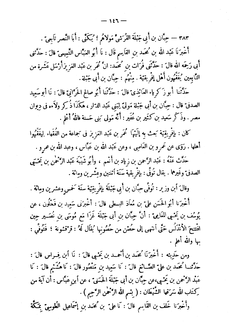 383 - حِبَّان بن أبي جَبْلَة القُرشِيِّ مَولاهُم؛ يُكَنَّى: أبا النَّصر تَابعِيّ.