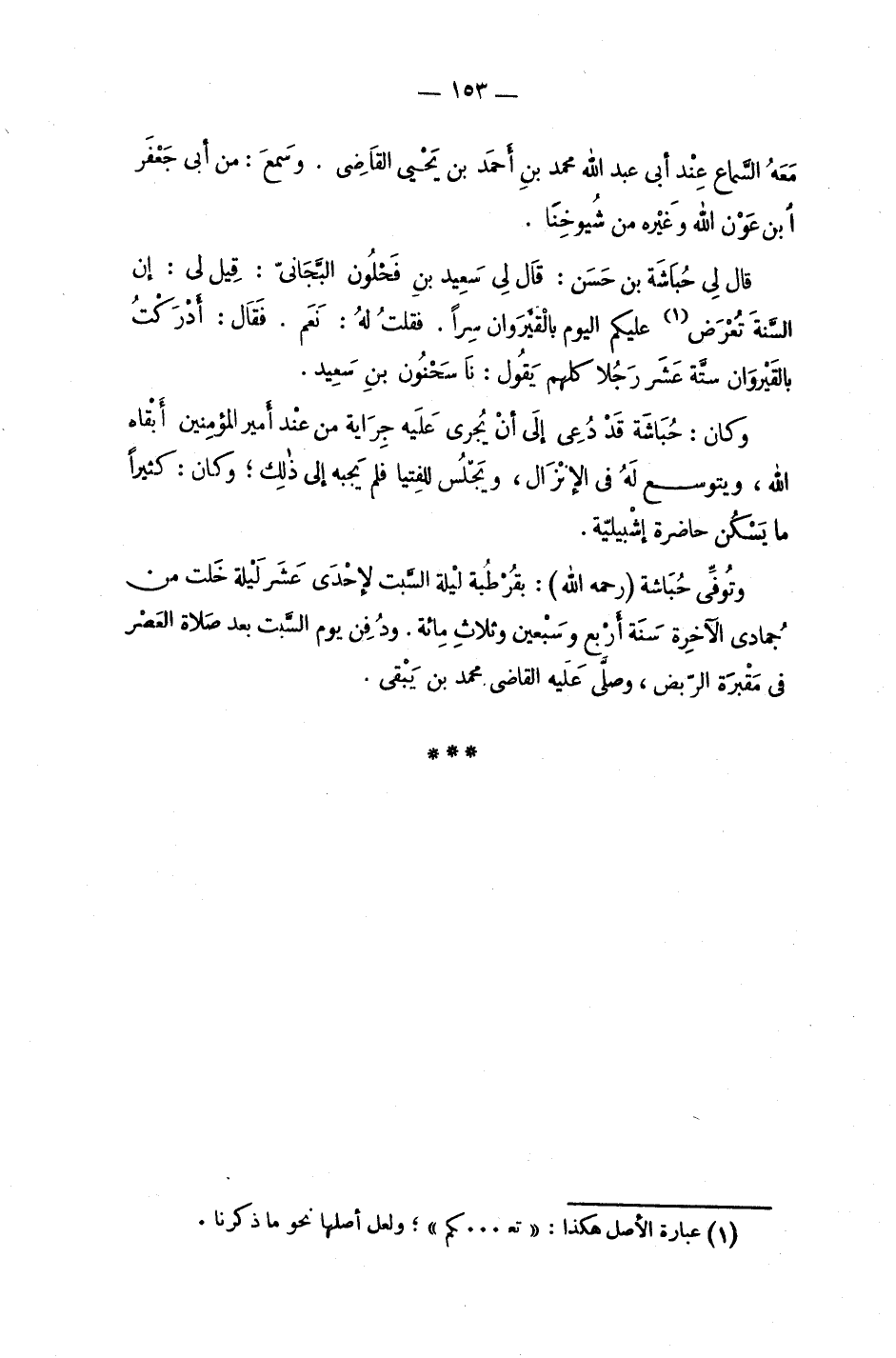 قال لِي حُبَاشَة بن حَسَن: قال لِي سَعيد بنِ فَحْلُون البَّجَانيّ: قِيل لي: إن السَّنة تُعْرَض عليكم اليوم بالقْيروان سِراً. فقلتُ لهُ: نَعَم. فقال: أدرَكْتُ بالقيْروان ستَّة عَشَر رَجُلاً كلهم يَقول: نَا سَحْنون بنِ سَعِيد.