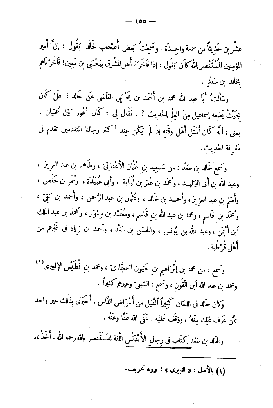 عشْرين حَديثاً من سمعة واحِدة. وسَمعتُ بعض أصْحاب خَالِد يَقُول: إنَّ أمير المؤمنين المُستنْصر بالله كان يَقُول: إذا فَاخَرَنا أهْل المشْرق بيَحْيَى بن مَعِين؛ فاخَرْنَاهم بِخالِد بن سَعْدٍ.