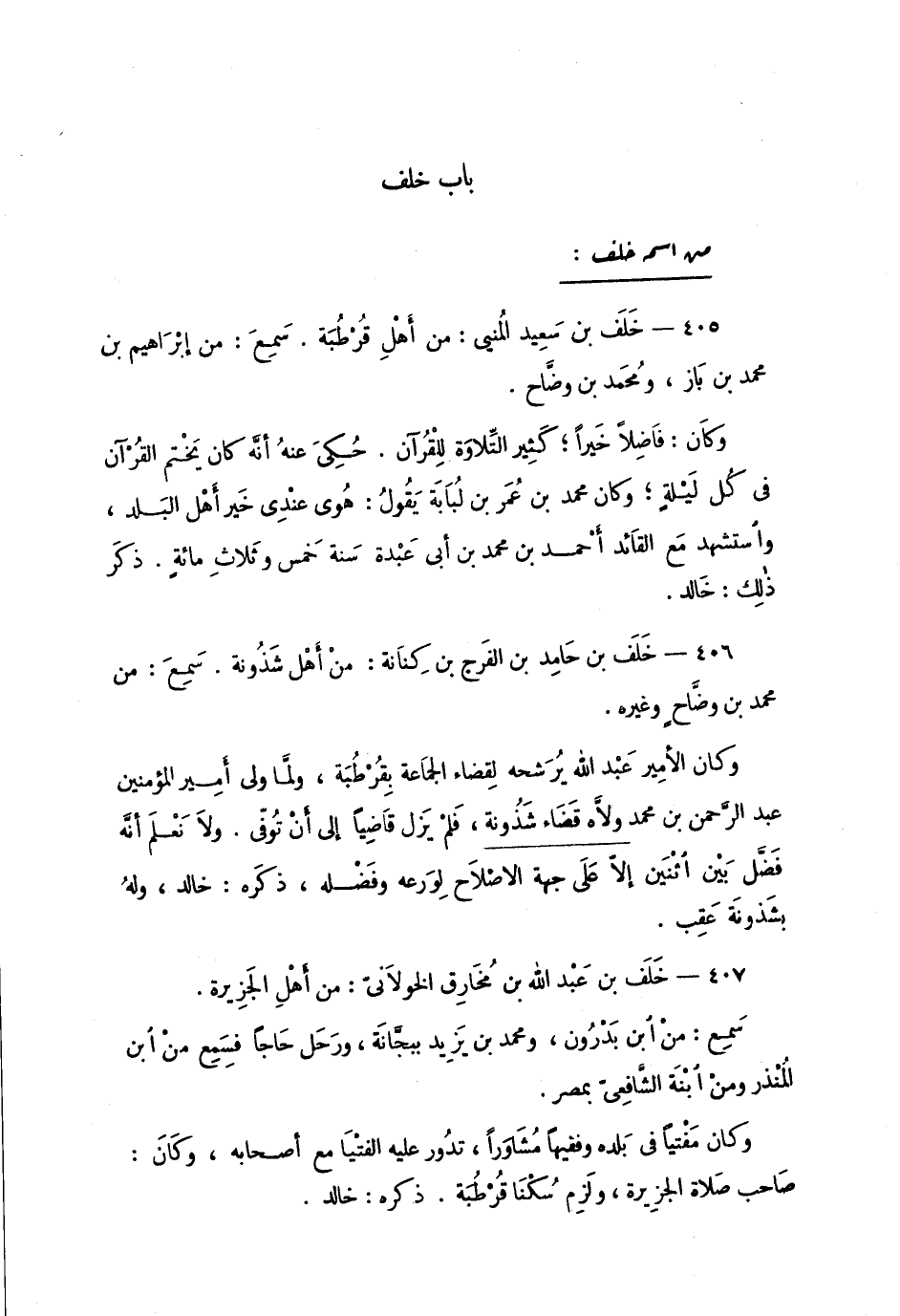 405 - خَلَفَ بن سَعيد المنُيي: من أهْل قُرْطُبَة. سَمِعَ: من إبراهيم بن مُحَمَّد بن بازَ، ومُحَمَّد بن وضَّاح.