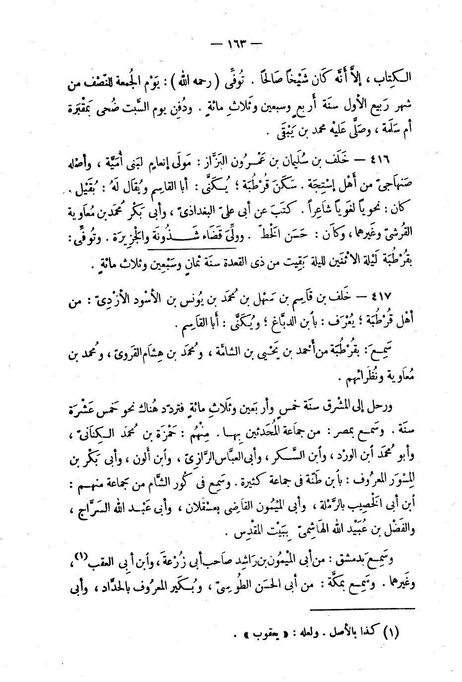 416 - خَلَفَ بن سُليمان بن عَمْرُون البَزَّاز: مَولَى إنعامٍ لَبني أُميَّة، وأصْله صَنهَاجيّ من أهْل إسْتِجَة. سَكَنَ قُرْطُبَة؛ يُكَنَّى: أبا القاسِم ويُقال لَهُ: بُقَيْل. كان: نحوياً لَغوياً شَاعِراً. كتَبَ عن أبي عليّ البغداديّ، وأبي بَكْر مُحَمَّد بن مُعاوية القُرشيّ وغيرهما، وكانَ: حسَن الخَطّ. وولَّىَ قَضَاء شذُونَة والجَزيرة. وتُوفِّي: بقُرْطُبَة لَيْلة الاثنين لليلة بَقيت من ذي القعدة سنَة ثمانٍ وسَبْعين وثلاثِ مائةٍ.