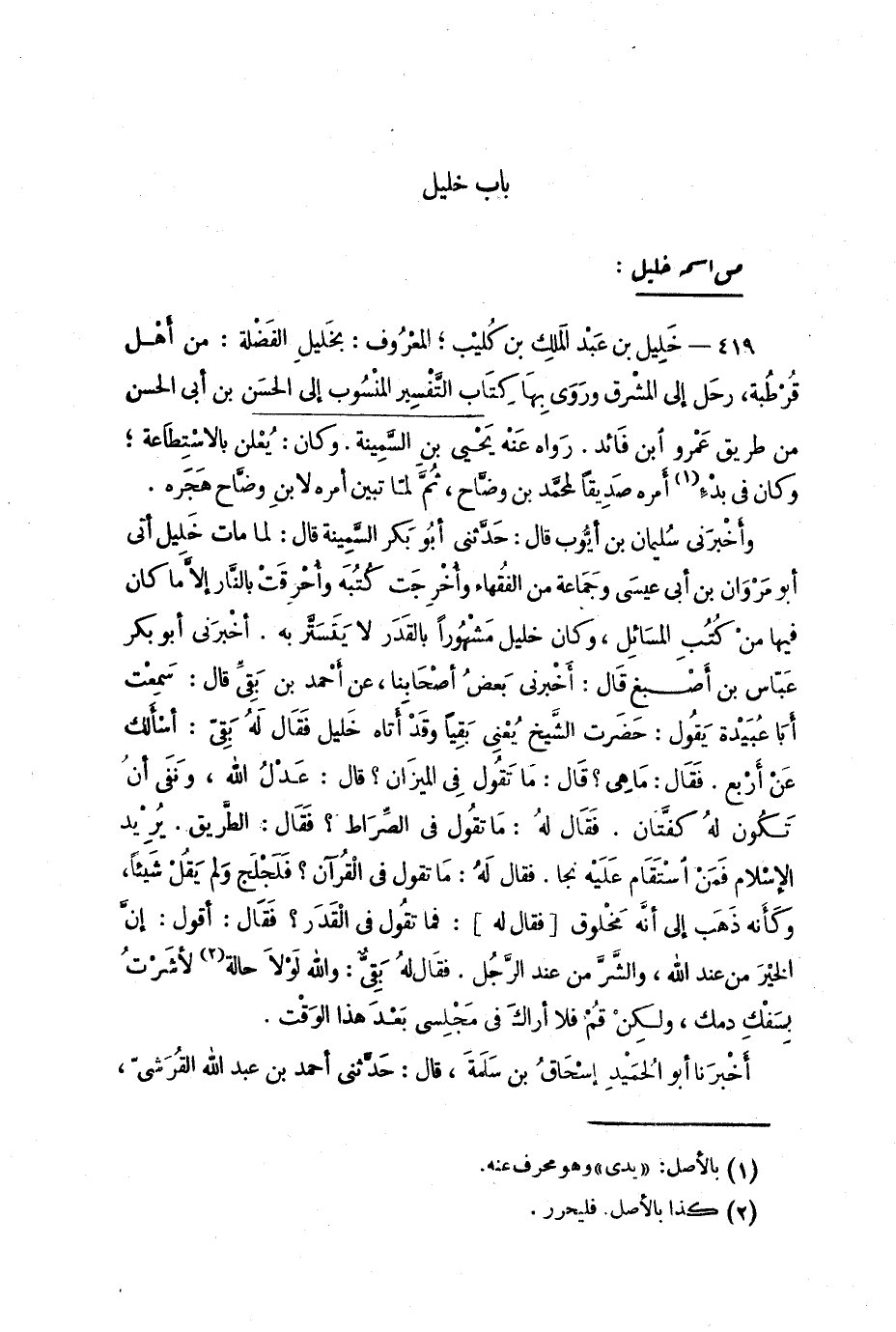 وأخبرني سُليمان بن أيُّوب قال: حدَّثني أبُو بَكر السَّمينة قال: لما مات خَليل أتى أبو مَروان بن أبي عيسَى وجَماعة من الفقهاء وأخْرجت كُتُبَه وأُحْرِقَتْ بالنَّار إلاَّ ما كان فيها كُتُبِ المسائِل، وكان خليل مَشْهُوراً بالقَدَر لا يَتَسَتَّر به. أخبرني أبو بكر عبَّاس بن أصْبغ قال: أخبرني بَعضُ أصحابنا، عن أحمد بن بَقِيَّ قال: سَمِعت أبا عُبيدة يَقول: حَضَرت الشَّيخ يُعنِي بَقياً وقَد أتاه خَلِيل فقال لَهُ بَقِيَّ: أسألك عَنْ أربع. فقال: ما هي؟ قَال: مَا تَقُول في الميزان؟ قال: عدلُ الله، ونفَى أن تَكُون لهُ كفَّتان. فقال له: مَا تقُول في الصِّراط؟ فَقَال: الطَّريق. يُريد الإسلام فَمَنْ آستقام عَلَيْه نجا. فقال لَه: مَا تقولُ في القرآن؟ فَلَجْلَج وَلم يَقُلْ شَيئاً، وكأنه ذهَب إلى أنه مَخْلوق فقال له: فما تقول في القَدَر؟ فَقَال؟ فقال: أقول: إنَّ الخَيرَ من عند الله، والشَّرَّ من عند الرَّجُل. فقال لهُ بقيٌّ: والله لَولاَ حالة لأشَرْتُ بِسَفْكِ دمك، ولكِن قُمْ فلا أراكَ في مَجْلِسي بَعْدَ هذا الوَقت.
