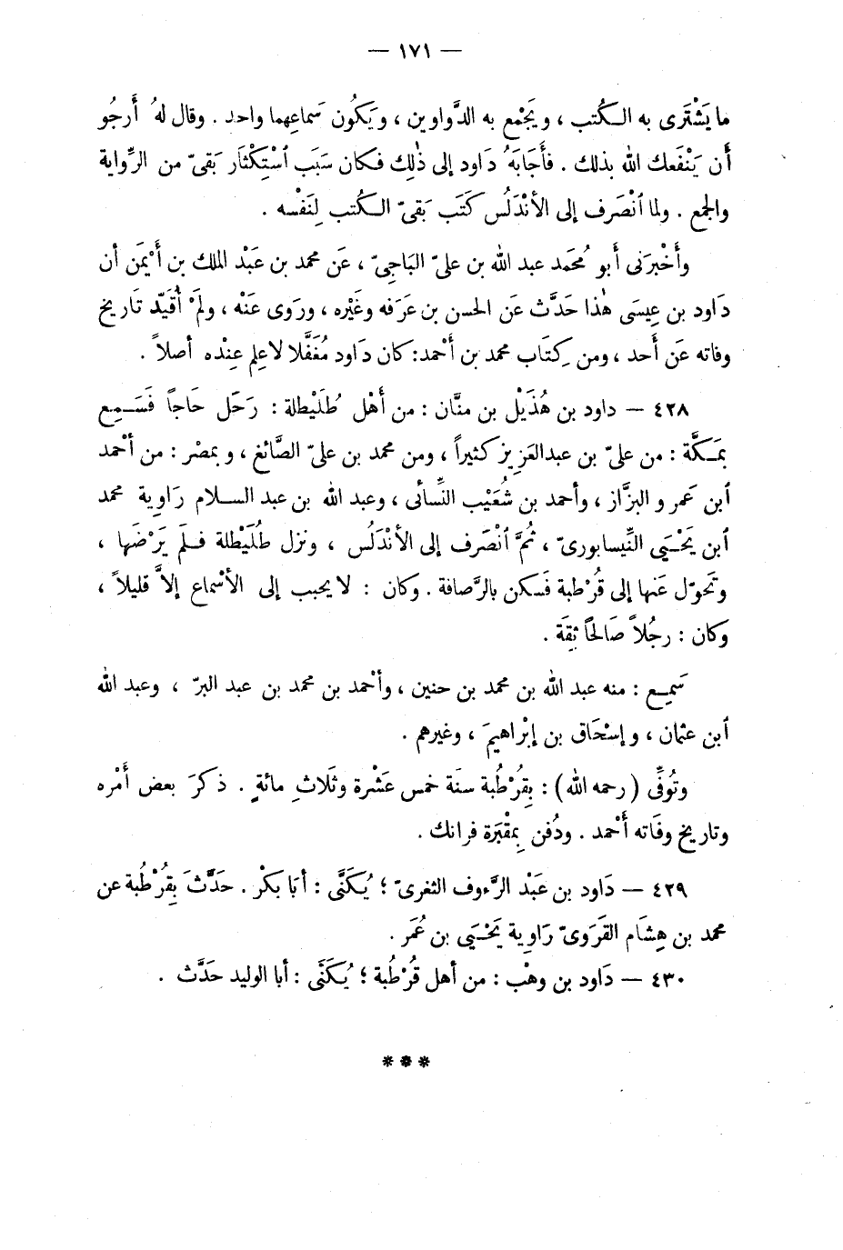 428 - دَاوُد بن هُذَيل بن منَّان: من أهْل طُليطلة: رَحَل حَاجاً فسمع بمكَّة: من عليّ الصَّائغ، وبمصر: من أحمد آبن عمر والبزَّاز، وأحمد بن شُعيب النِّسائي، وعَبْدالله بن عبد السَّلام رَاوية مُحَمَّد آبن يَحْيى النِّيسابوريّ، ثُمَّ آنصَرف إلى الأندلُس، ونزل طُليْطلة فلَم يَرْضَها، وتَحوّل عَنها إلى قُرْطُبَة فسكن بالرَّصافة. وكان: لا يحبب إلى الأسماع إلا قليلاً، وكان: رجلاً صَالِحاً ثِقَة.