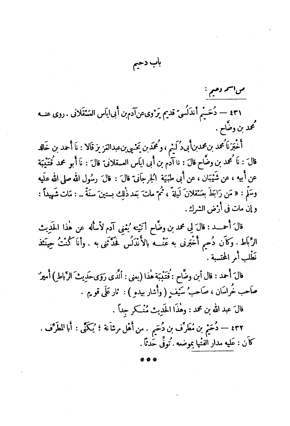 431 - دُحَيْم أنْدَلُسيّ قديم يَروْي عن آدم بن أبي ايَاس العَسْقَلاني. روى عنه مُحَمَّد بن وضَّاح.