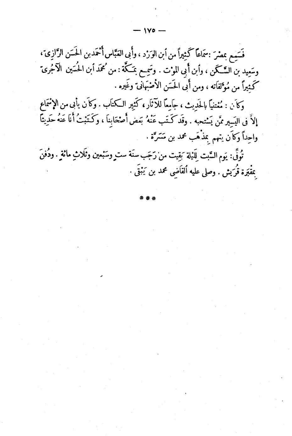 تُوفِّي: يوم السَّبت لِلَيْلة بَقيت من رَجَب سنة ستٍ وسَبْعين وثلاثِ مائةٍ. ودُفِنَ بِمقْبَرة قُريش. وصلى عليه القَاضي مُحَمَّد بن يَبْقَى.