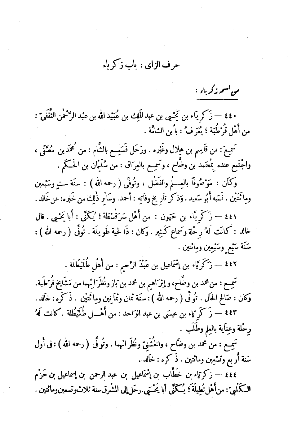 444 - زَكرِيّاء بن خَطَّاب بن إسماعيل بن عَبْد الرَّحمن بن إسماعيل بن حَزم الكَلْبيّ: من أهل تُطِيلَة؛ يُكَنَّى: أبا يحيى. رحَل إلى المشْرق سنة ثلاث وتسعين ومائتين.