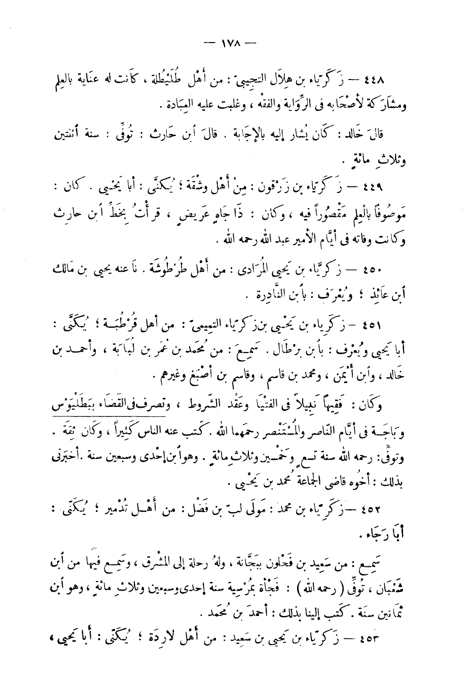 448 - زَكرِيّاء بن هِلاَل التجِيبيّ: من أهْل طُلَيْطُلة، كانت لع عِناية بالعلم ومشَارَكة لأصحابه في الرِّوَاية والفقه، وغلبت عليه العِبَادة.