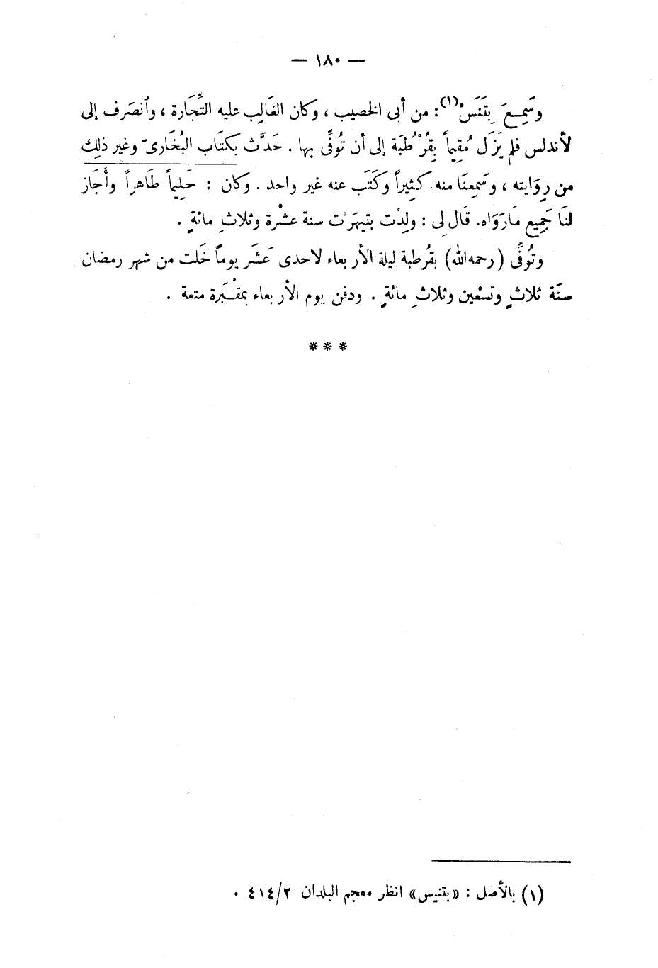 وسَمِع بِتَنَسْ: من أبي الخصيب، وكان الغَالِب عليه التِّجارة، وآنصرف إلى الأندلس فلم يَزَل مُقيماً بِقُرْطُبَة إلى أن تُوفِّي بها. حدَّث بكتاب البُخاريّ وغير ذلك من رِوَايته، وسَمِعَنا منه كثيراً وكَتَب عنه غير واحد. وكان: حليماً طَاهِراً وأجَاز لنا جميع ما رواه. قال لِي: ولِدْت بتيهرت سنة عشْرة وثلاثِ مائةٍ.