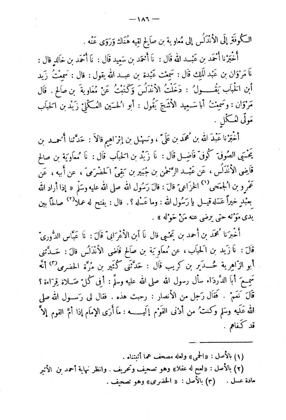 أخْبرَنا مُحَمَّد بن أحمد بن يحيى قال نَا آبن الأعرابيّ قَالَ: نَا عبَّاس الدُّوريّ قال: نَا زَيْد بن الحبَاب، عن معاوية بن صالِح قاضي الأندلُس قال: حدَّثني أبو الزاهرية حُدَير بن كريب قال: حَدَّثَني كُثير بن مُرَّة الحضرمي أنَّه سَمِعَ أبَا الدَّرداء سأل رسول الله صلى الله عليه وسلَّم: أفي كُلّ صَلاة قِراءة؟ قَالَ: نَعَمْ. فَقَال رَجل من الأنصار: رحبت هذه. فقال لي رَسول الله صلى الله عليه وسلم وكنتُ من أدنى القَوم إليه: مَا أرى الإمام إذا أمَّ القوم إلاَّ قد كفاهم.
