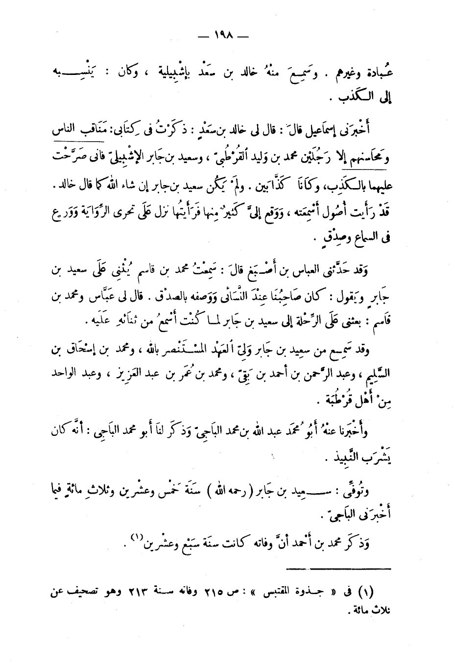 أخْبرني إسماعيل قالَ: قال لي خالد بن سَعْدٍ: ذكرتُ في كِتابي: منَاقب الناس ومَحَاسِنهم إلا رَجُلين مُحَمَّد بن وليد القُرْطُبيّ، وسَعِيد بن جَابر الإشبيليّ فاني صَرَّحت عليهما بالكَذِب، وكانا كَذَّابَين. ولم يَكُن سَعِيد بن جابِر إن شاء الله كما قال خالد. قَدْ رَأيت أُصُول أسْمِعَت، ووقع إليَّ كَثيرٌ مِنها فَرَأيتها نزل عَلَى تحري الرِّوايَة وَوَرعٍ في السماع وصِدقٍ.