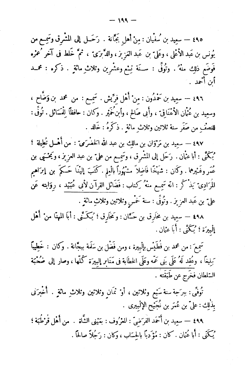 495 - سَعِيد بن سُفيان: من أهْل بَجَّانة. رحل إلى المشرِق وسَمِع من يُونُس بن عبد الأعلى، وعليّ بن عبد العزيز، والدَّبَريّ، ثمَّ خلط في آخر عُمره فوضع ذلك منْهُ. وتُوفِّي: سنَة تِسع وعشرين وثلاثِ مائةٍ. ذكره: مُحَمَّد بن أحمد.