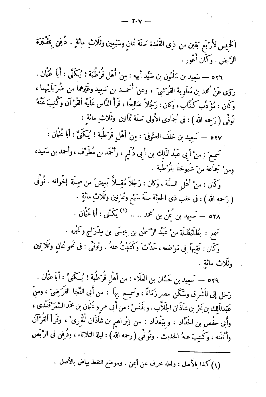 526 - سَعِيد بن سلْمون بن سَيِّد أبيه: من أهْل قُرْطُبَة؛ يُكَنَّى: أبا عُثْمان. رَوَى عن مُحَمَّد بن مُعاوية القُرَشيّ، وعنْ أحمد بن سَعِيد وغيرهما من ضُربَائهما، وكان: مُؤدِّب كُتَّاب، وكان: رجُلاً صالحاً، قَرأ النَّاس عليه القُرآن وكُتِبَ عنهُ تُوفِّي (رحمه الله) : في جُمادي الأولى سَنة ثمانين وثلاثِ مائةٍ: