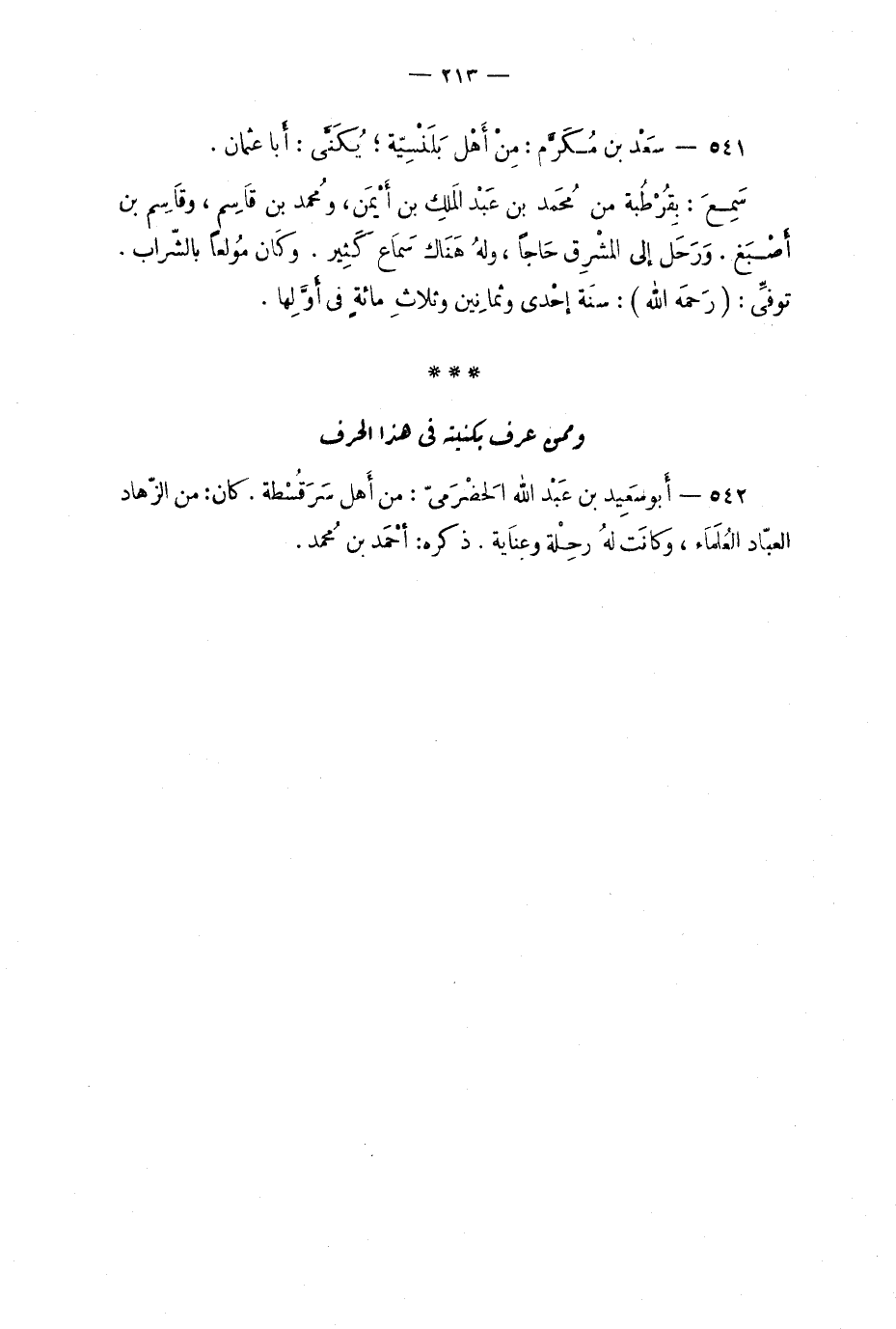 542 - أبو سَعِيد بن عَبْدالله الحضْرَميّ: من أهْل سرقُسْطَةَ. كان: من الزّهاد العبّاد العُلماء، وكانت لهُ رِحلة وعناية. ذكره: أحمد بن مُحَمَّد.