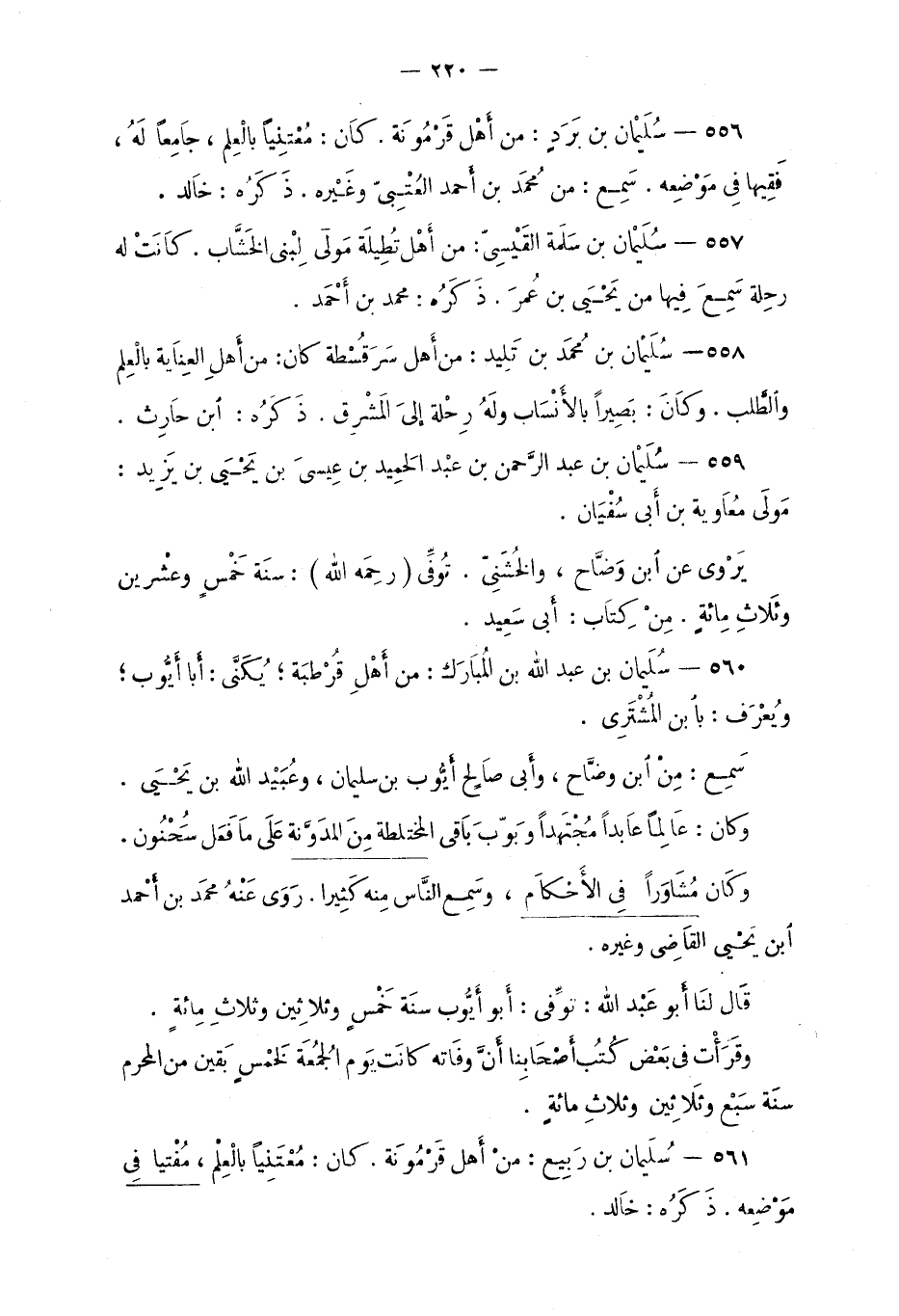 556 - سُلَيْمان بن بَرَدٍ: من أهْل قَرمُونَة. كانَ: مُعتنياً بالعِلْم، جامعاً لهُ، فَقيهاً في مَوْضِعه. سَمِع: من مُحَمَّد بن أحمد العُتَبيّ وغيرَه. ذكره: خَالِد.