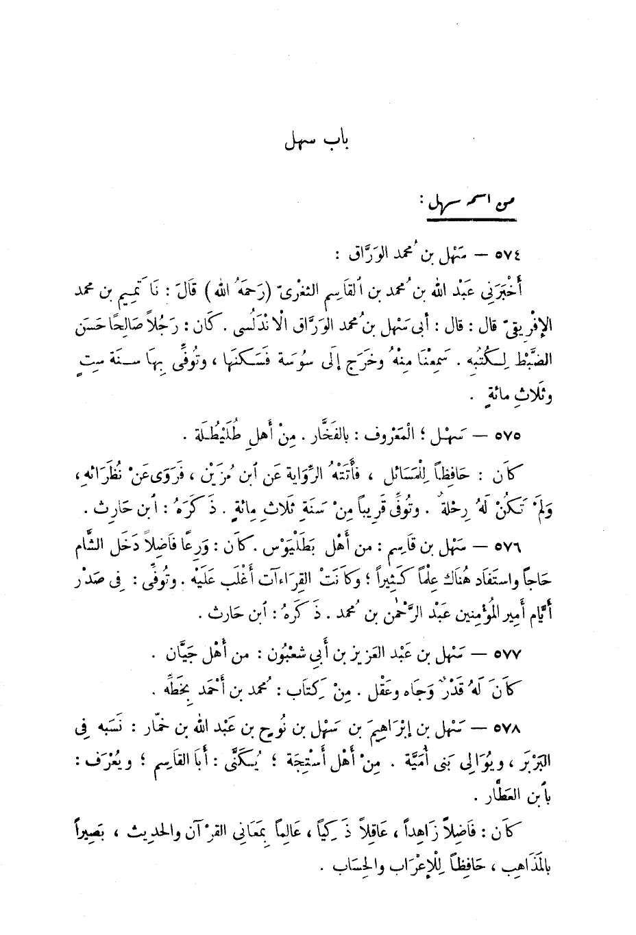 574 - سَهْل بن مُحمد الوَرَّاق: أخْبَرَنِي عَبْد الله بن مُحمد بن القَاسِم الثغْريَ (رَحمَهُ الله) قالَ: نَا تَمِيم بن محمد الإفْريقيّ قال: أبى سهْل بن مُحمد الوَرَّاق الانْدَلُسي. كان: رَجُلاً صَالِحاً حَسَن الضَّبْط لِكُتُبِهِ. سَمِعْنا مِنْهُ وخَرَج إلى سوُسَة فَسَكَنَها، وَتُوفِّي بِها سنَة سِتٍ وثَلاثِ مائةً.