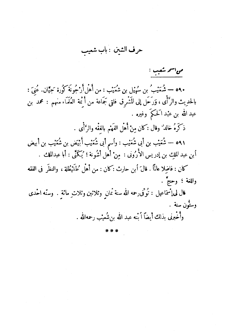 590 - شُعَيْب بن سُهيْل بن شُعَيْب: من أهل أرْجُونة كُورة جَيَّان. عُنِيَ: بالحدِيث والرّأي، وَرَحَل إلى المَشْرِق فلقى جَمَاعة من أئِمة العُلَمَاء منهم: محمد بن عبد الله بن عبْد الحَكم وغيره.