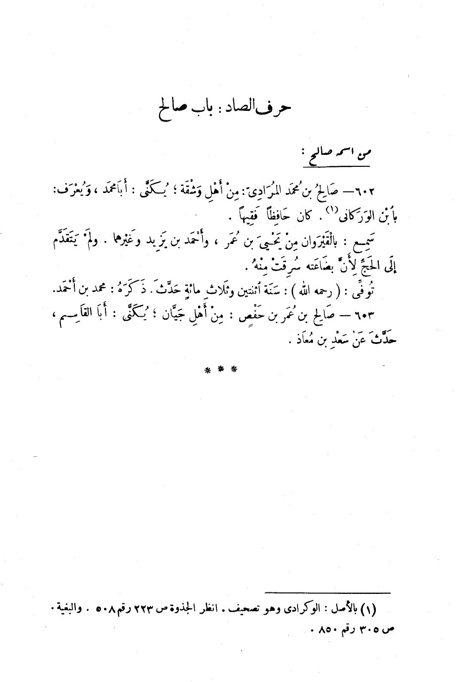 602 - صالِح بن مُحمد المُراديّ: من أهلِ وَشْقة؛ يُكَنّى: أبا محَمد، وَيُعرَف: بابن الوَركاني1. كان حافِظاً فَقيهاً.