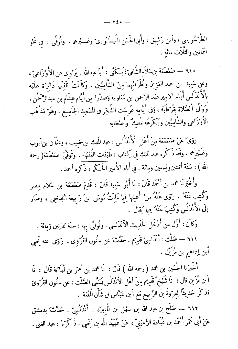 610 - صَعْصَعة بن سَلامة الشّاميّ؛ يُكَنّى: أبا عَبْد الله. يَروي عَنْ الأوْزاعيّ، وعن سَعيد بن عبد العَزيز ونُظرائِهما مِنْ الشّاميِّين. وكانَتْ الْفِتْيا دَائِرة عَليْه بالأندَلُس أيام الأمير عبْد الرّحمن بن مُعاوية وَصدْرا من أيّام هِشام بن عبد الرّحمن. ووُليَّ الصّلاة بِقُرْطُبَة، وفي أيّامِه غُرِسَت الشّجَر في المَسْجِد الجامِع. وَهوَ مَذْهَب الأوْزَاعي والشّاميّين ويَكْرهُه مالِكٌ وأصْحابه.