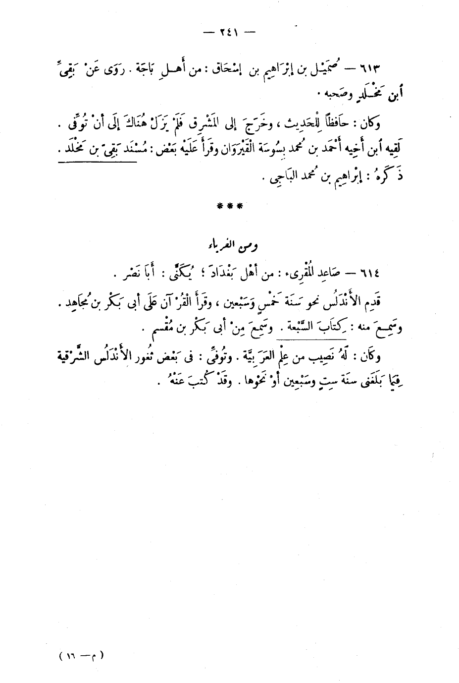 613 - صُمَيْل بن إبْراهِيم بن إسْحاق: من أهْلِ باجَة. رَوَى عَنْ بَقِيِّ ابن مَخْلَدٍ وصَحبه.