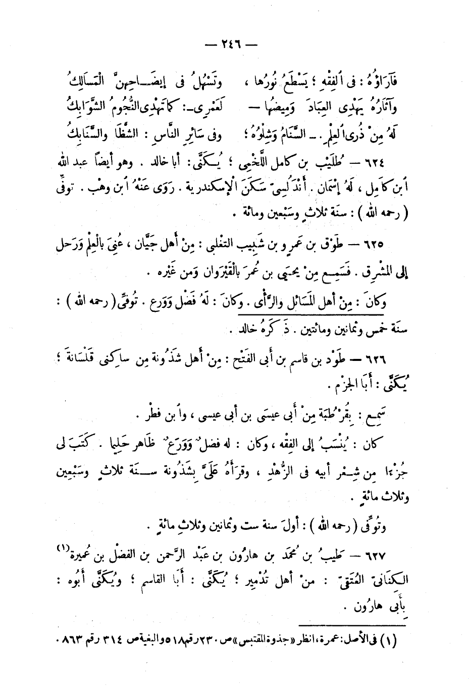 624 - طُلَيْب بن كامل اللَّخمي؛ يكَنّى: أبا خالِد. وهو أيضاً عبد الله ابن كامل، لهُ اسْمَان. أنْدَلُسيّ سَكَنَ الإسْكَندرية. رَوى عنْهُ ابن وهْب. توفِّي (رحمه الله) : سنة ثلاثٍ وسَبْعين ومائة.
