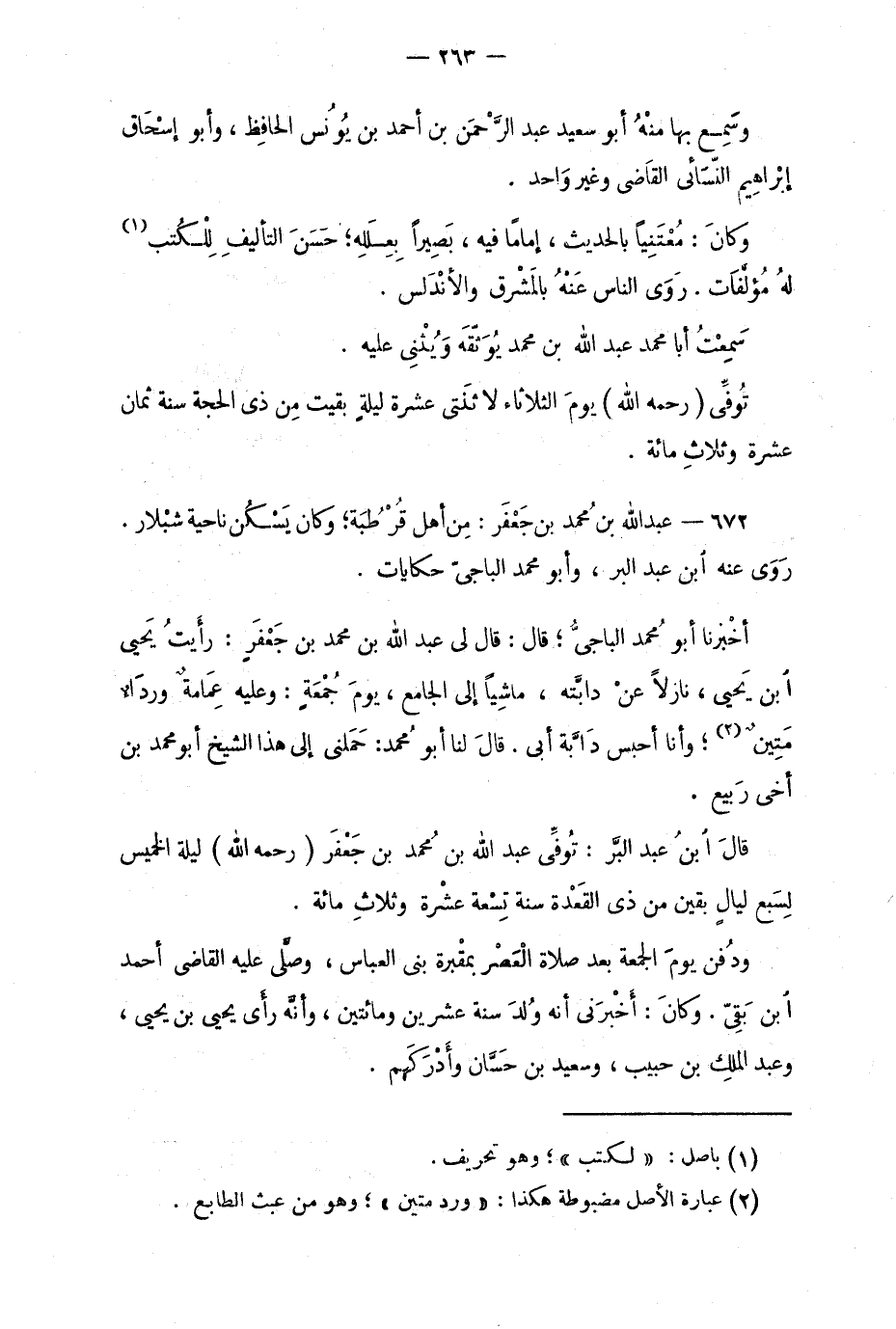672 - عبد الله بن مُحمد بن جَعْفَر: مِن أهْل قُرطُبة؛ وكانَ يَسْكُن ناحية شبْلار. رَوَى عنه ابن عبد البرّ، وأبو محمد الباجيّ حكايات.