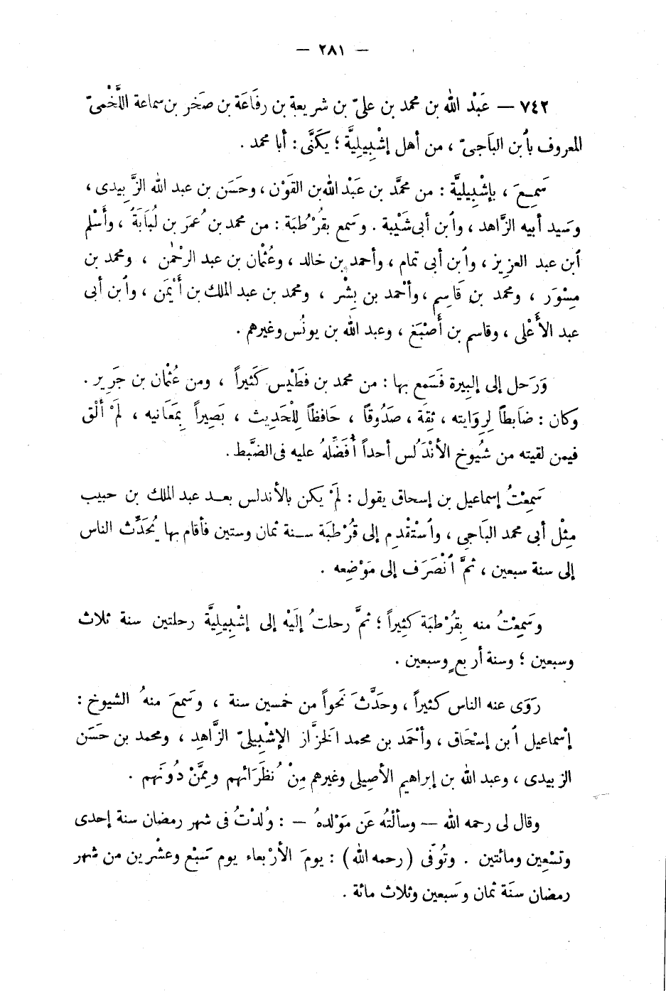 742 - عبد الله بن محمد بن عليّ بن شَريعة بن رَفاعَة بن صَخر بن سماعة الّلخميّ المعروف بابن الباجيّ، من أهل إشْبيليّة؛ يُكنّى: أبا محمد.