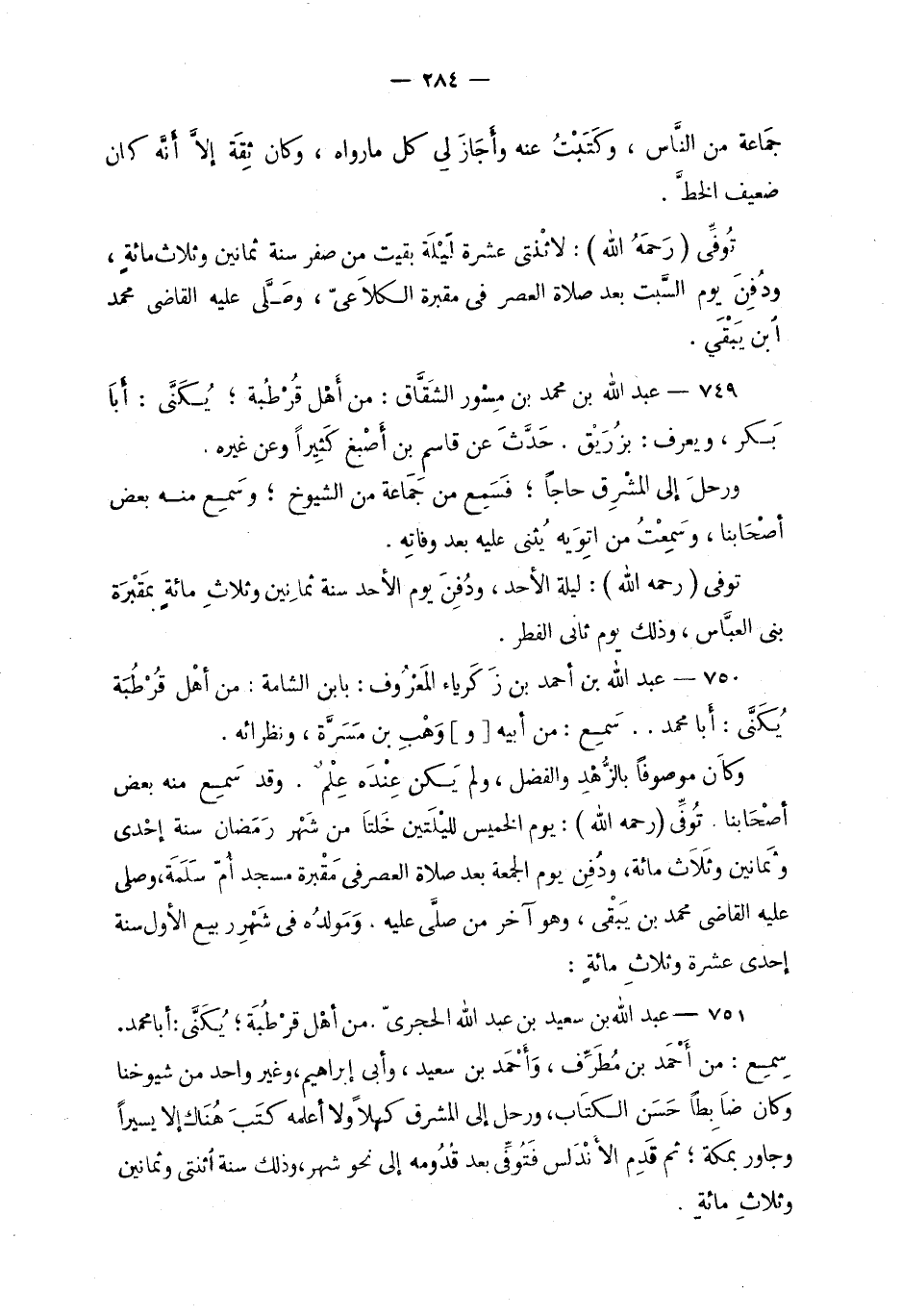 750 - عبد الله بن أحمد بن زَكَرياء المعروف: بابن الشامة: من أهْل قُرطُبة؛ يكنّى: أبا محمد.. سمعَ: من أبيه ووَهْبِ بن مَسَرَّة، ونظرائه.