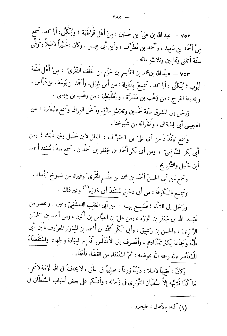 753 - عبد الله بن محمد بن القاسِم بن حَزْم بن خَلَف الثّغْريّ: منْ أهْل قَلْعة أيّوب؛ يُكنّى: أبا محمد. سمعَ بِتُطيلة: من ابن شِبْل، وأحمد بن يوسُف بن عبّاس. وبمدينة الفرج: من وَهْب بن مَسَرّة. وبِطُلَيطَلة: من وهْب بن عيسى.