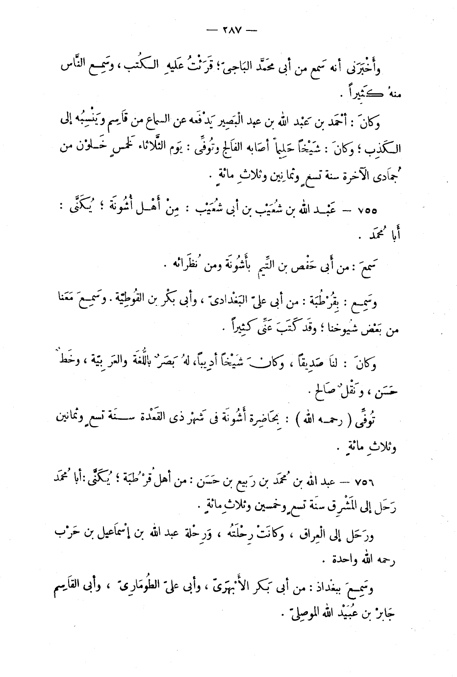 756 - عبد الله بن محمد بن رَبيع بن حَسَن: من أهْل قُرطُبة؛ يُكَنّى: أبا محمد. رَحَل إلى المَشْرِق سنة تسعٍ وخمسين وثلاثِ مائةٍ.