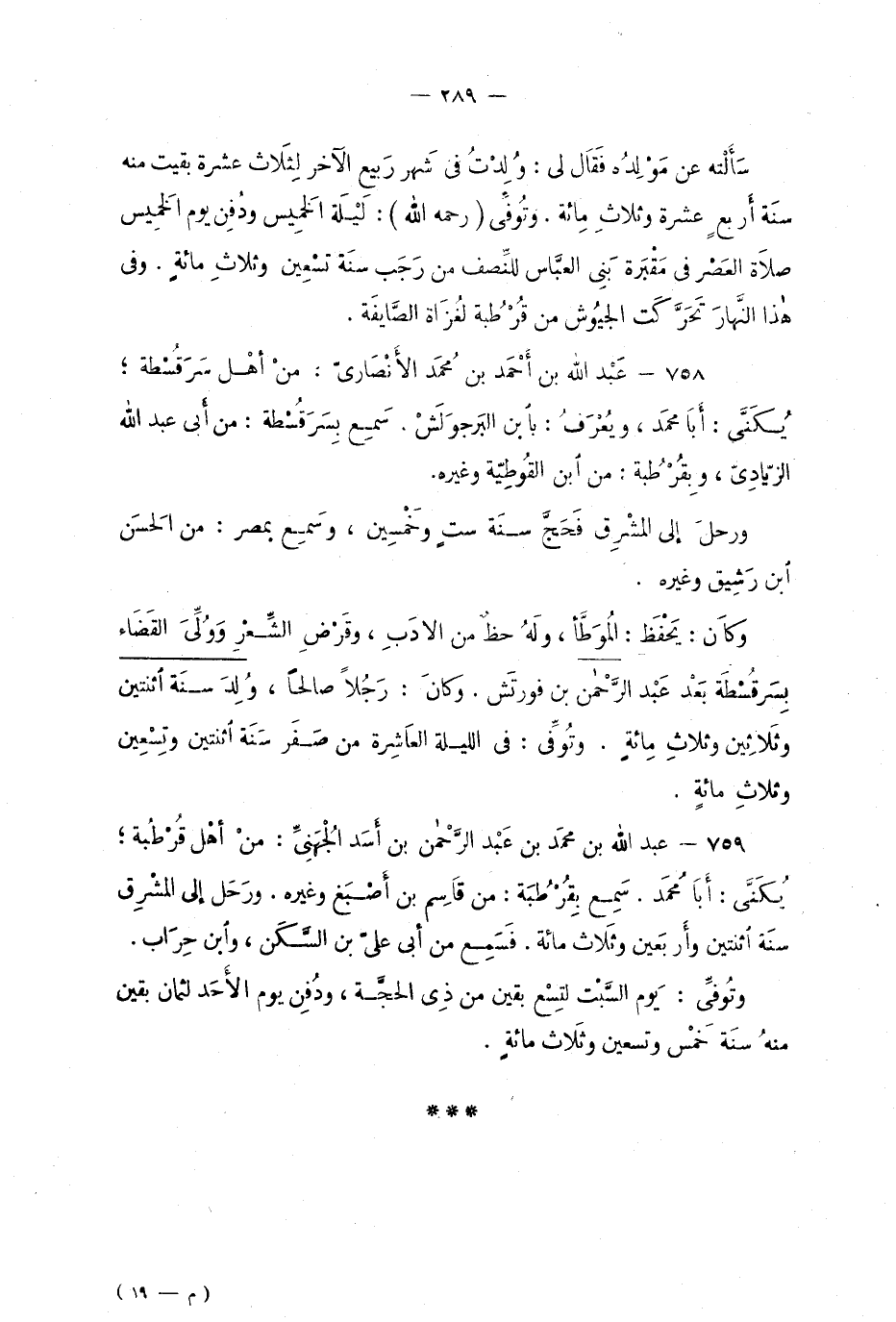 759 - عبد الله بن محمد بن عبد الرّحمن بن أسَد الجُهَنِيّ: منْ أهْل قُرطُبة؛ يُكنّى: أبا محمد. سمعَ بِقُرطُبة: من قاسِم بن أصَبغ وغيره. وَرَحَل إلى المَشرِق سنة اثنتين وأرْبَعين وثلاث مائة. فسَمعَ من أبي عليّ بن السّكَن، وابن حِراب.