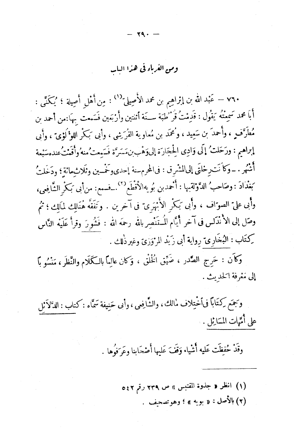 760 - عبد الله بن إبْراهِيم بن محمد الأصيليّ: من أهلِ أصِيلة؛ يُكنّى: أبا محمد. سمعتَهُ يقول: قَدِمْتُ قُرطُبة سنة اثنتين وأرْبَعين فَسَمِعت بها: من أحمد بن مُطَرّفٍ، وأحمد بن سَعيد، ومحمد بن مُعاوية القُرَشي، وأبي بَكْر اللؤْلؤيّ، وأبي إبراهِيم: وَرَحَلتُ إلى وادِي الحِجارة إلى وَهْب بن مَسَرّة فَسَمِعت منهُ وأقَمْتُ عندهُ سَبْعة أشْهُر. - وكانَت رِحْلَتي إلى المَشْرِق: في المحرَم سنة إحدى وخَمْسين وثلاثِ مائةٍ؛ ودَخَلتُ بَغدادَ: وصاحبُ الدّولة بها: أحمد بن بُويه الأقْطَع. - فسمع: من أبي بكْرِ الشّافعيّ، وأبي عليّ الصوّاف، وأبي بَكْر الأبْهَريّ في آخرين. وتَفَقّه هُنالِك لمالِك؛ ثمّ وصَل إلى الأنْدَلُس في آخر أيّام المُسْتَنْصِر بالله رحمه الله: فَشُوِرَ وقرأَ علَيْه النّاس كِتاب: البُخاريّ رِوايَة أبي زيد المرْوَزيّ وغير ذلك.