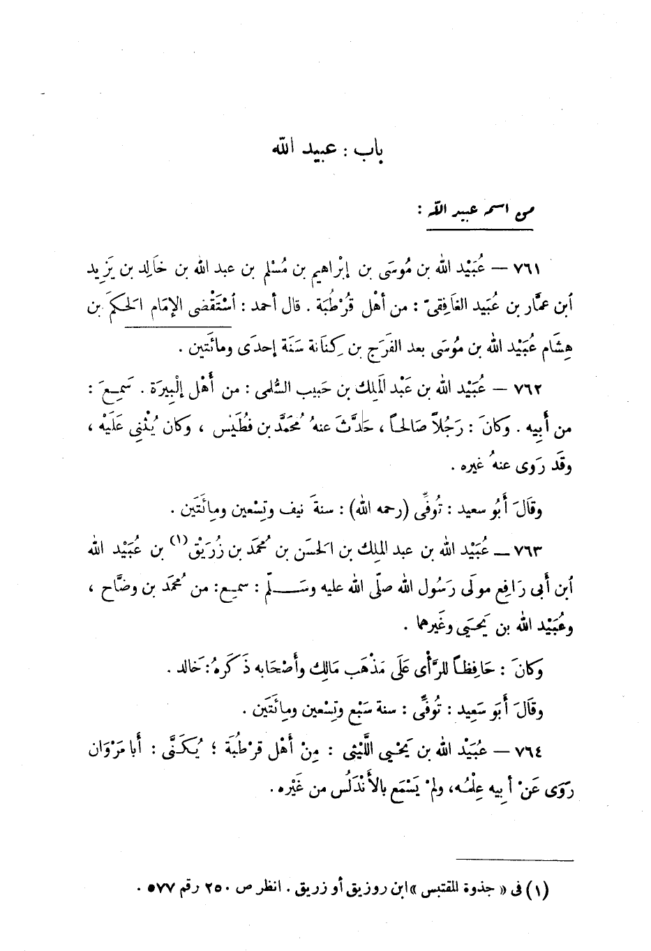 763 - عُبَيْد الله بن عبد الملِك بن الحَسَن بن مُحمد بن زُرَيْق بن عُبَيْد الله ابن أبي رافِع مولَى رَسول الله (: سمعَ: من مُحمد بن وضّاح، وعُبَيْد الله بن يَحيى وغَيرهما.