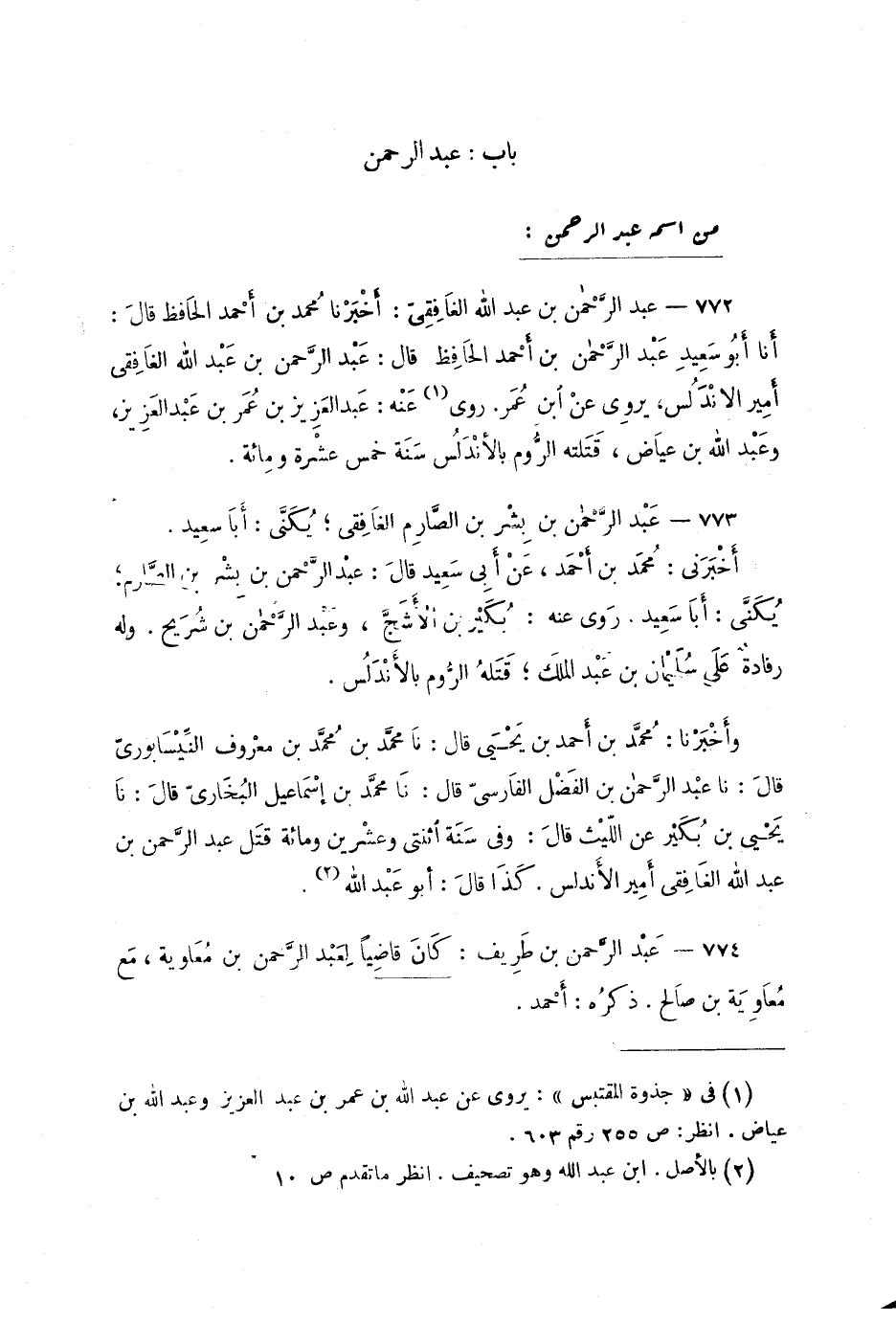 772 - عبد الرّحمن بن عبد الله الغافِقيّ: أخْبَرنا محمد بن أحمَد الحافِظ قال: أنا أبو سَعيد عَبْد الرّحمن بن أحْمَد الحافِظ قال: عبْد الرّحمن بن عبد الله الغافِقي أمِير الأنْدَلُس، يروِى عنْ ابن عُمَر. رَوى1 عنْهُ: عبد العَزيز بن عُمَر بن عبد العزيز، وعبْد الله بن عيَاض، قَتَلته الرُّوم بالأنْدَلُس سَنَة خمس عشْرة ومائة.
