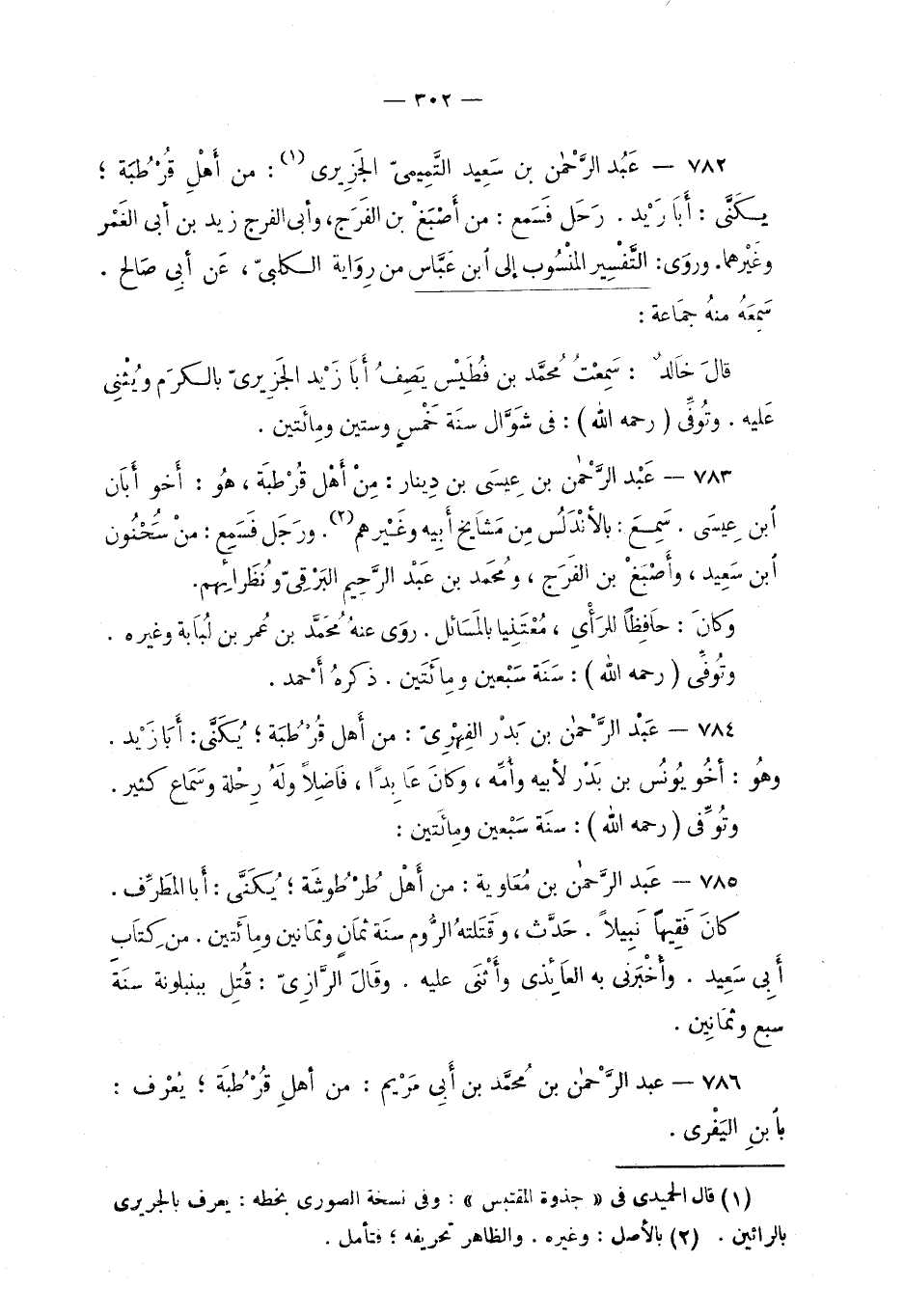 782 - عبد الرّحمن بن سَعيد التّميميّ الجَزِيري: من أهْلِ قُرطُبة؛ يكنّى: أبا زَيْد. رَحَل فَسمعَ: من أصْبَغ بن الفرج، وأبي الفرج زيد بن أبي الغَمْر وغَيرهما. وروَى: التّفْسير المَنْسوب إلى ابن عَبّاس من رِوايَة الكلبيّ، عن أبي صالِح. سمِعَهُ منهُ جماعة.
