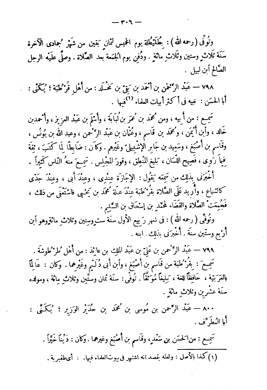 798 - عبد الرّحمن بن أحمد بن بقيّ بن مُخْلَد: من أهْل قُرطُبة؛ يكنّى: أبا الحسن: نبيه في أكثر أبيات العلماء2 فيها.