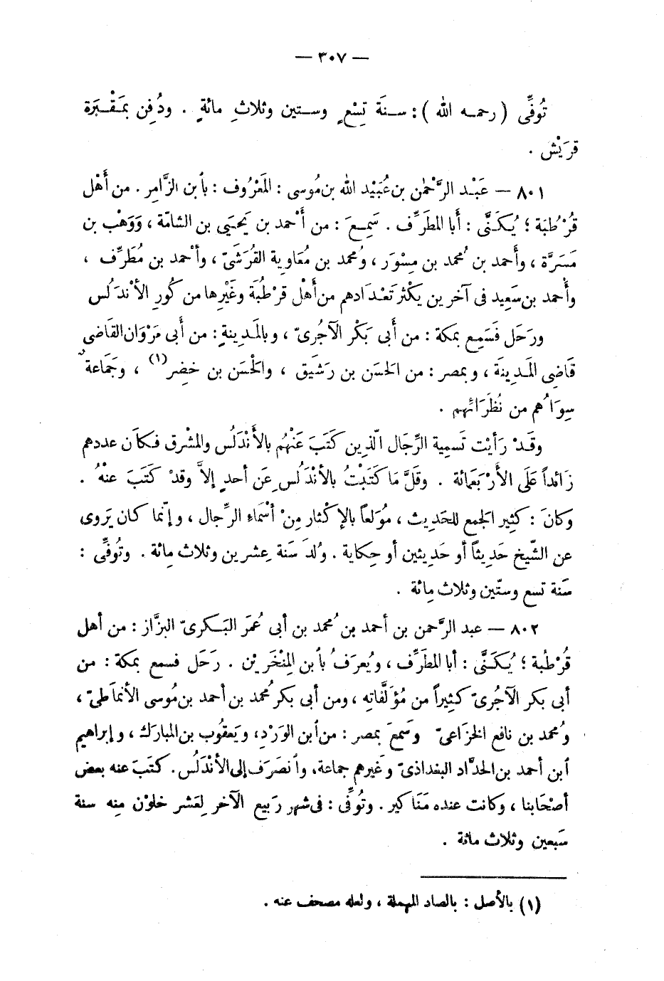 801 - عبد الرحمن بن عُبَيْد الله بن موسى: المعُروف: بابن الزّامر. من أهْل قُرطُبة؛ يُكنّى: أبا المُطَرِّف. سمعَ: من أحمد بن يحيى بن الشامّة، وَوَهْب بن مَسَرّة، وأحمد بن سَعيد في آخرين يكْثر تَعْدادهم من أهْل قُرطُبة وغَيرها من كُورِ الأندَلُس.
