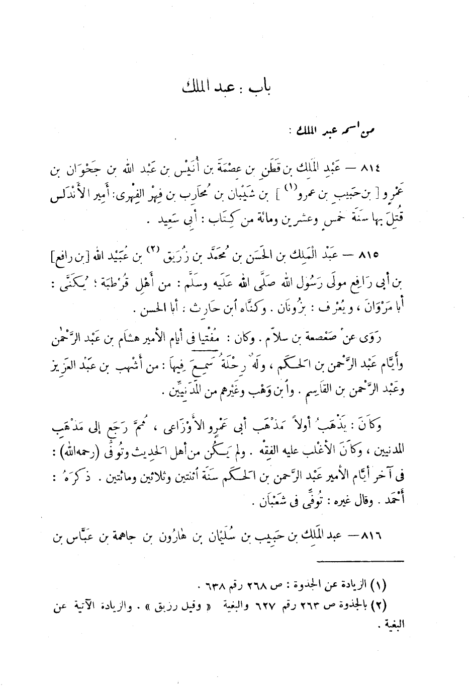 815 - عبد الملِك بن الحَسَن بن مُحمد بن زُرَيق بن عُبَيْد الله بن رافِع بن أبي رافِع مولَى رَسُول الله (: من أهْل قُرطُبة؛ يُكنّى: أبا مَروان، ويُعْرَف: بزُونان. وكنّاه ابن حارِث: أبا الحسن.
