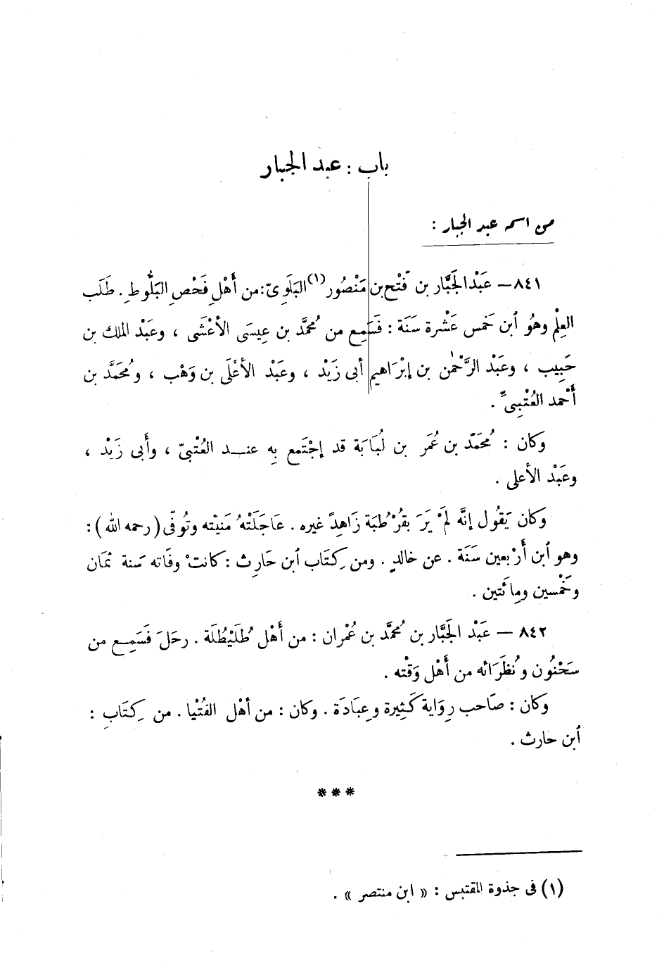 841 - عبد الجبار بن فّتْح بن مَنصور البلوي: من أهل فَحْص البلّوطِ. طَلَبَ العِلم وهو ابن خمْس عشرة سنة: فسمعَ من محمد بن عِيسى الأعشى، وعبد الملِك بن حَبيب وعبد الرّحمن بن إبْراهِيم أبي زَيد، وعبد الأعلى بن وَهْب، ومحمد بن أحمد العُتبيّ.