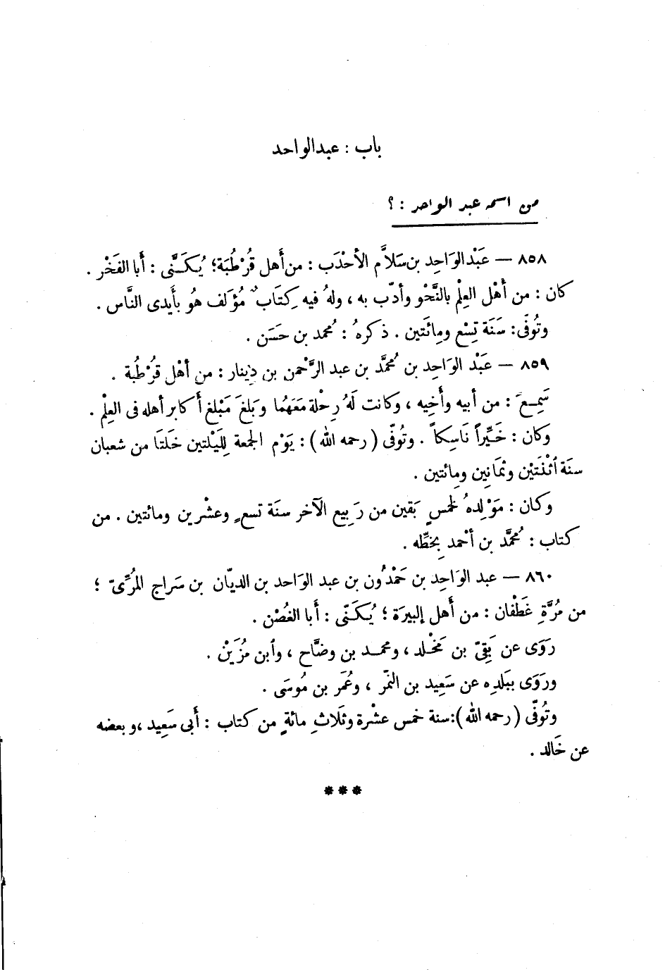 858 - عَبْد الوَاحِد بن سَلاَّم الأحْدَب: من أهل قُرْطُبَة؛ يُكَنَّى: أَبا الفَخْر. كان: من أهْل العِلْم بالنَّحْو وأدّب به، ولهُ فيهِ كتَابٌ مُؤَلف هُو بأَيدي النَّاس.