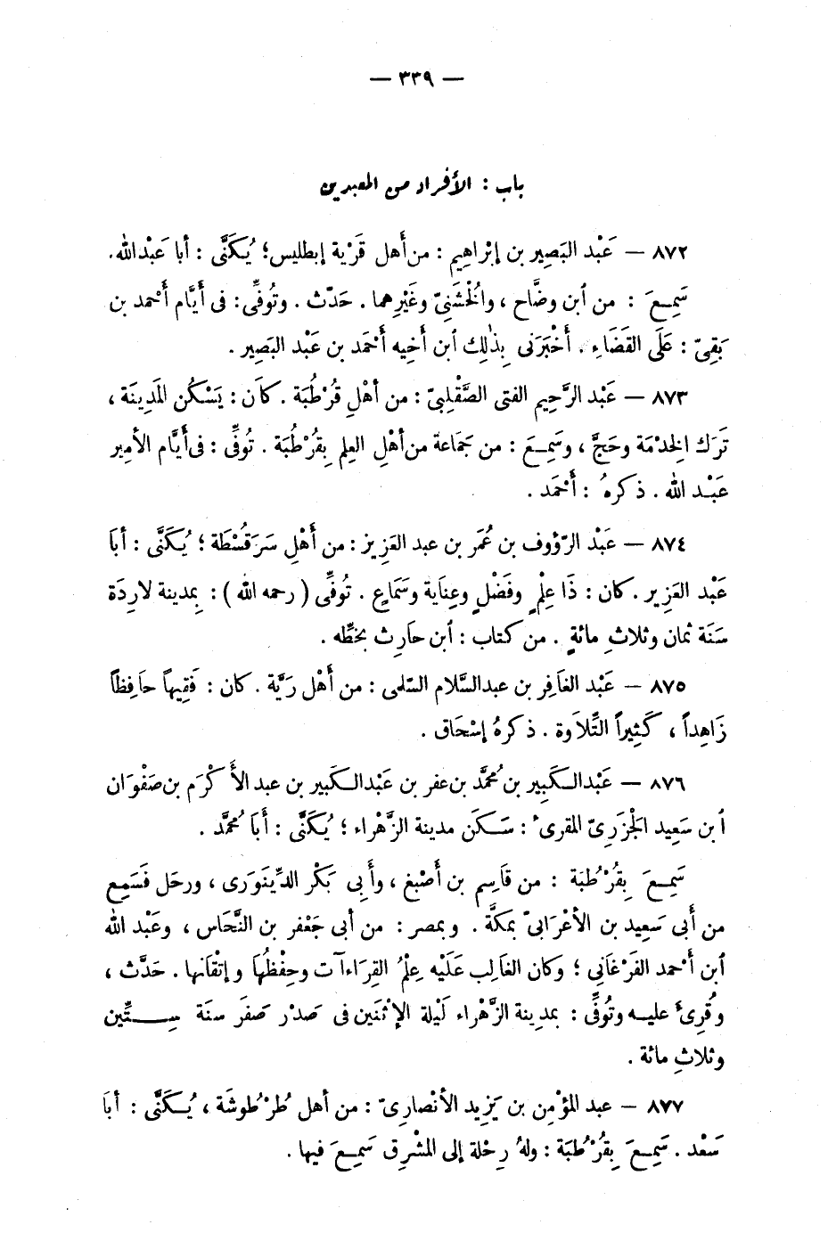 874 - عبد الرؤوف بن عُمَر بن عبد العزيز: من أهْل سَرَقُسْطَة؛ يُكنّى: أبا عبد العزيز. كانَ: ذا عِلْمٍ وفَضْلٍ وعِنايَة وسَماعٍ. تُوفّي (رحمه الله) : بِمَدينة لارِدَة سنة ثمان وثلاثِ مائةٍ. من كتاب: ابن حارِث بخطِّه.