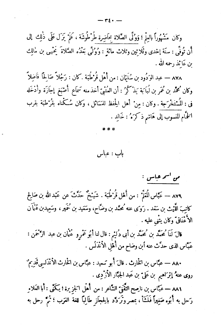 880 - عَبّاس بن الحارِث. قالَ أبو سَعيد: عَبّاس بن الحارث الأنْدَلُسي قَديمٌ روى عنهُ إبراهِيم بن عليّ بن عبد الجبّار الأزْدِي.