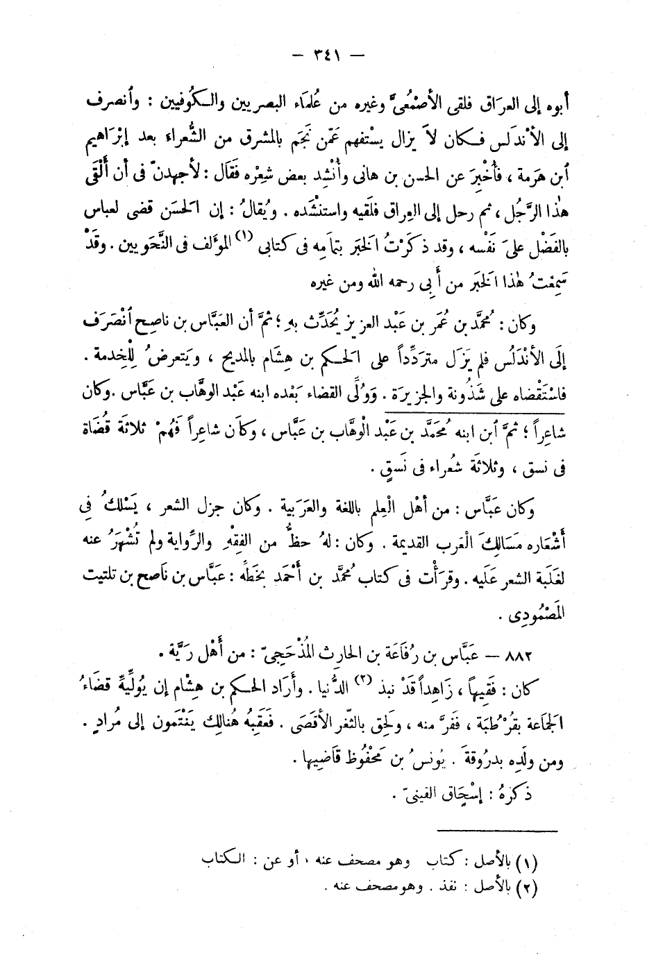 أبوه إلى العِراق فلَقيَ الأصْمَعيَّ وغيره من عُلماء البصريين والكُوفيين: وانصرف إلى الأنْدَلُس فكان لا يَزال يسْتفهم عَمّن نَجَم بالمَشْرِق من الشُّعراء بعد إبْراهِيم ابن هَرمة، فأُخْبِرَ عن الحسن بن هاني وأنْشِد بعض شِعْره فقال: لأجهدنّ في أن ألْقَى هذا الرّجُل، ثم رحل إلى العِراق فلَقيه واستنْشَده. ويُقالُ: إن الحَسَن قضى لعباس بالفضْل على نَفْسه، وقد ذكَرْتُ الخَبَر بتمامِه في كتابي المؤَلف في النَّحَويين. وقَدْ سَمِعْتُ هذا الخَبَر من أبي رحمه الله ومن غَيره.